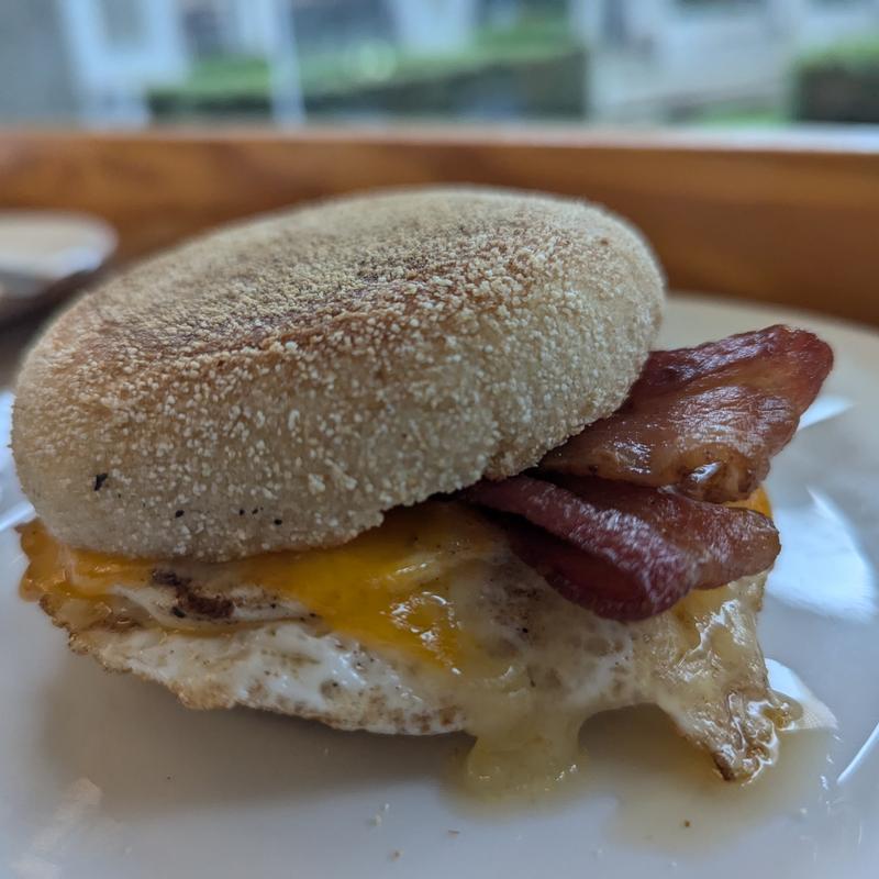 Ham, bacon or avocado, fried egg, cheddar, on English Muffin